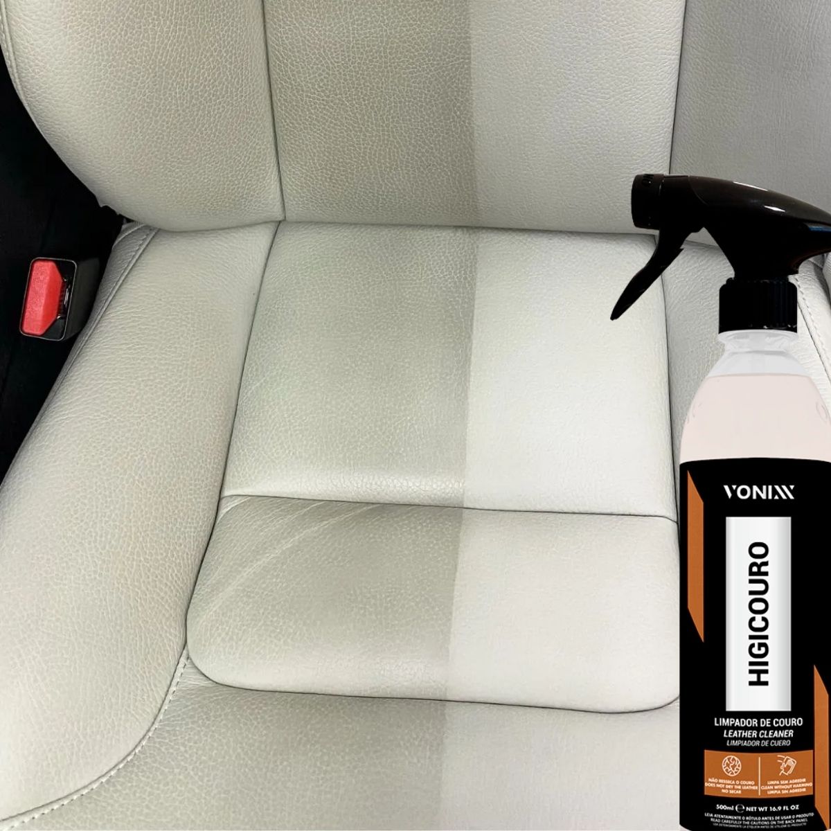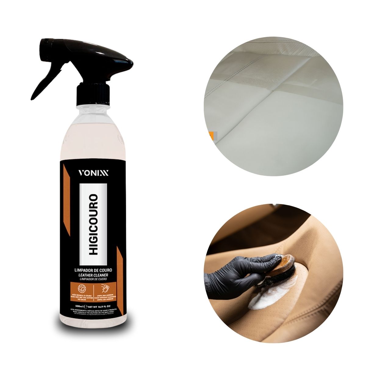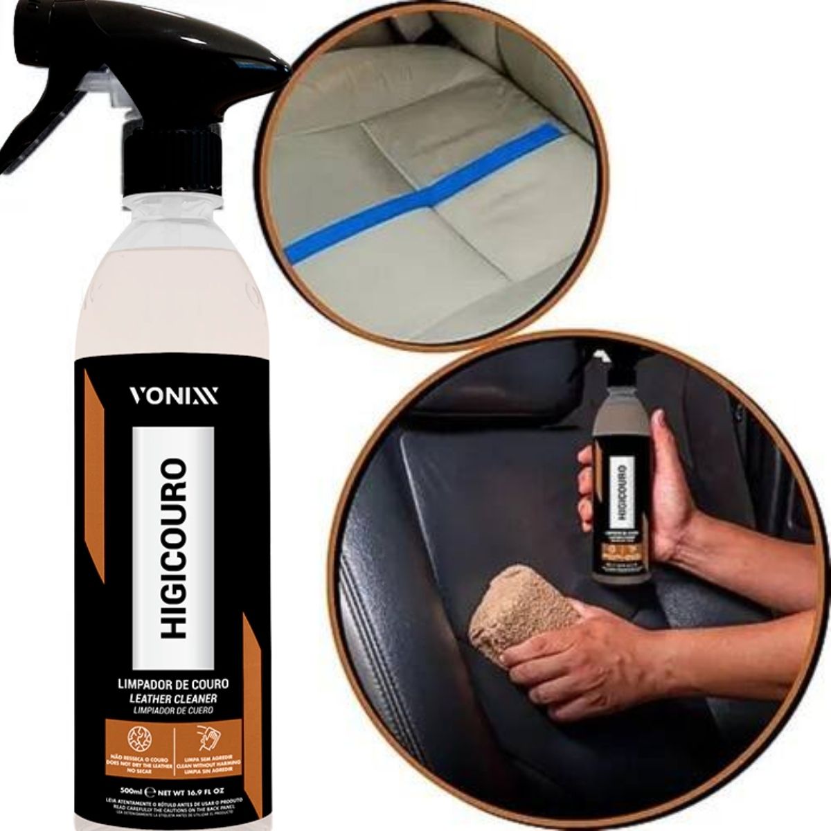 HIGICOURO limpa com segurança bancos e outras superfícies de couro de veículos e remove impurezas com extrema facilidade, sem agredir o material e renovando o seu aspecto.