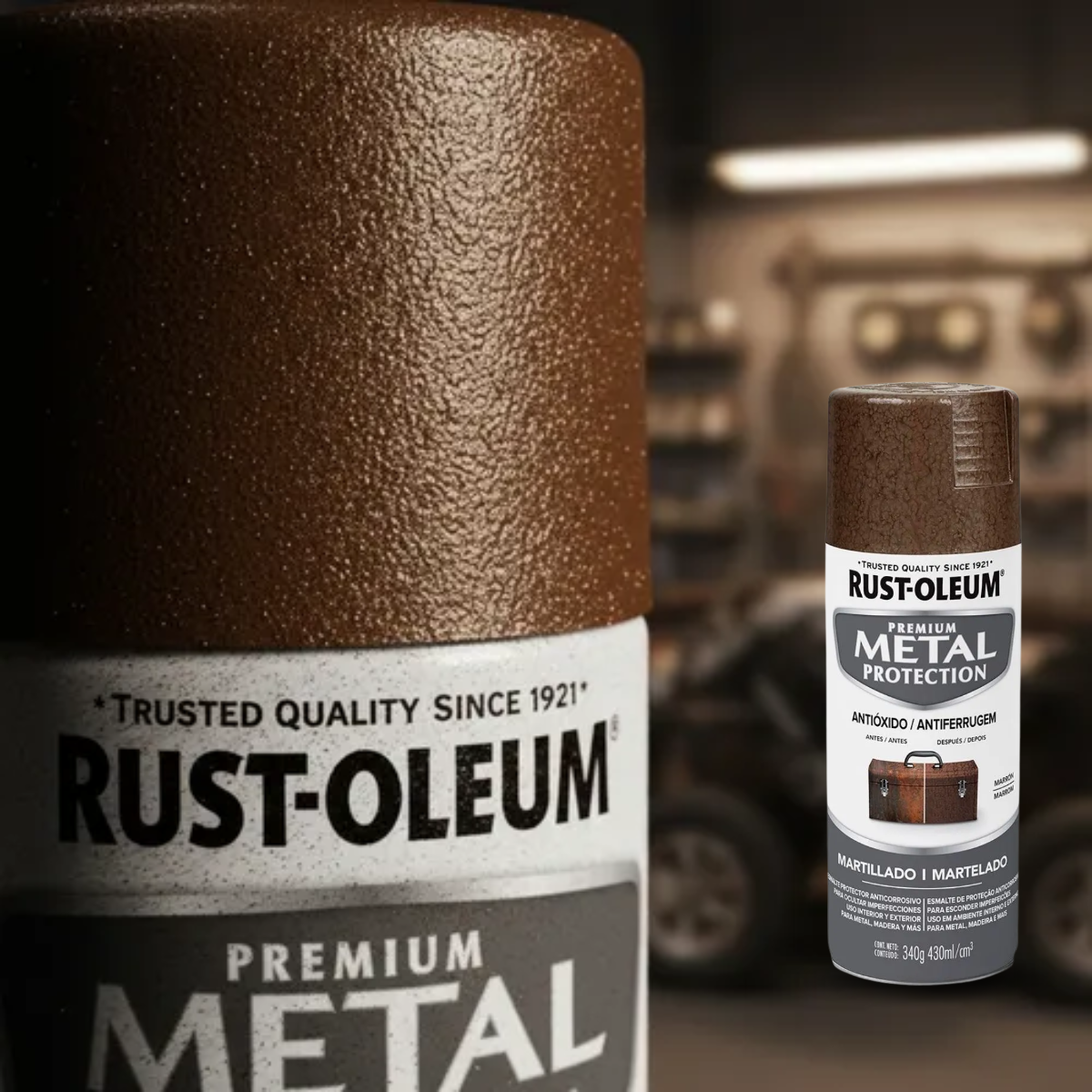 O Spray Rust-Oleum Metal Protection Martelado Marrom Brilhante é uma tinta anticorrosiva de alto desempenho desenvolvida para proteção e renovação de superfícies metálicas. Seu acabamento martelado brilhante cria efeito texturizado que disfarça imperfeições, riscos e áreas com ferrugem, proporcionando visual renovado e acabamento profissional.