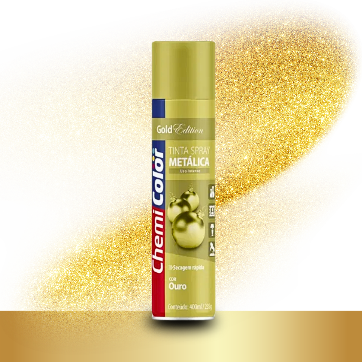 A Tinta Spray Metálica Ouro Chemicolor é um acabamento decorativo de alta qualidade e secagem rápida, ideal para quem busca efeito dourado sofisticado e brilho intenso em projetos de decoração e artesanato. Disponível nas versões 400ml e 250ml, oferece cobertura uniforme, excelente rendimento e acabamento metálico brilhante.