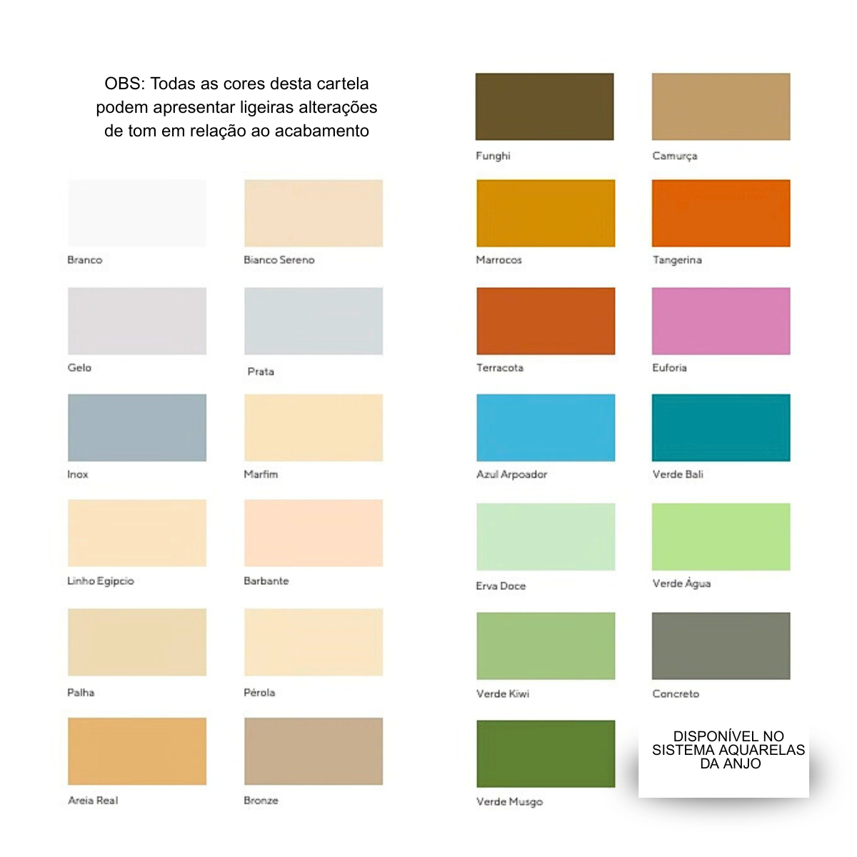 Disponível em diversas cores através do Sistema Aquarelas Anjo. Consulte a cartela de cores para escolher a tonalidade ideal para seu projeto.