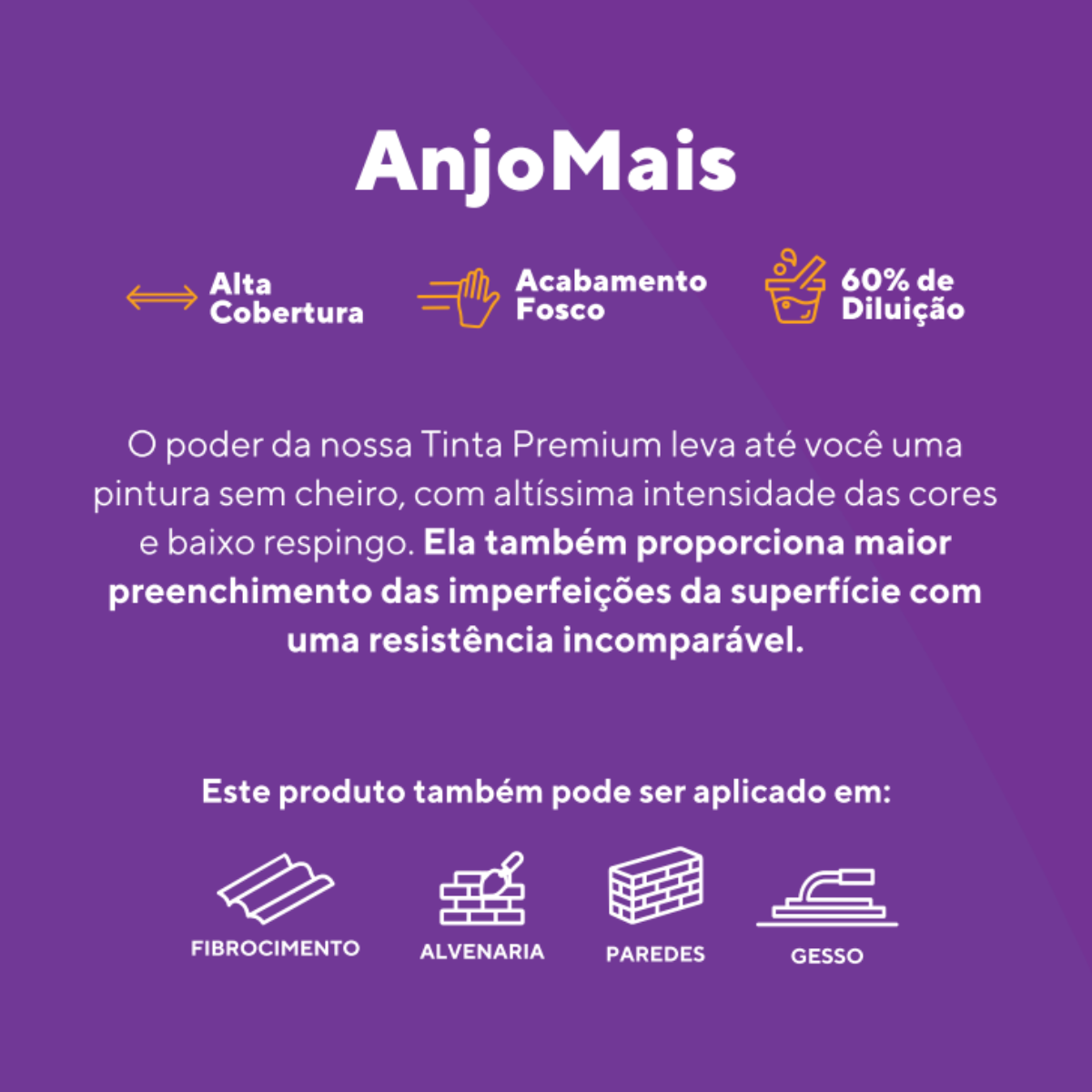 A Tinta Acrílica Premium Anjo Mais é ideal para quem busca qualidade superior, excelente cobertura e acabamento fosco elegante. Indicada para ambientes internos e externos, proporciona um resultado uniforme, resistente e sofisticado, sendo adequada tanto para projetos residenciais quanto comerciais.
